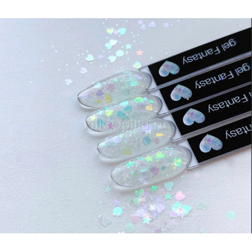 Гель с голографическими частицами разной формы: сердечки, звезды, кружочки и другие элементы, создающие многослойный блеск????✨