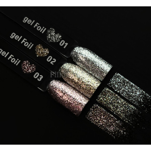 Foil gel - коллекция гелей для дизайна со слюдой. Роскошное сочетание серебряного, золотого и розового оттенков. Благодаря своей плотности они станут незаменимым элементом стильного маникюра в зимний сезон.