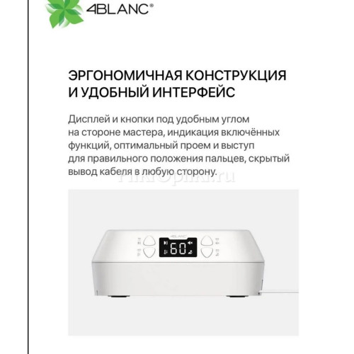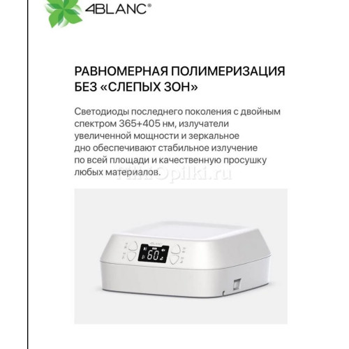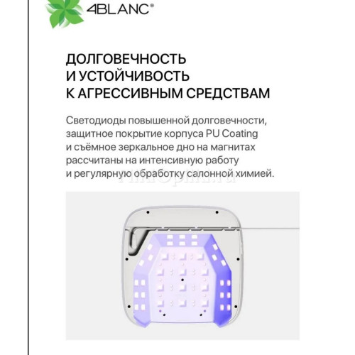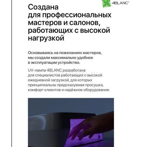 UV-лампа 4BLANC — это профессиональное оборудование для маникюра и педикюра, созданное для быстрой, безопасной и комфортной полимеризации любых покрытий. Диоды нового поколения с длиной волны 365+405 нм обеспечивают равномерную сушку, не перегревают материал и максимально бережно воздействуют на кожу клиента. Лампа обладает увеличенным ресурсом работы — до 1500 часов непрерывной эксплуатации, что делает её идеальным выбором для салонов красоты и частных мастеров.